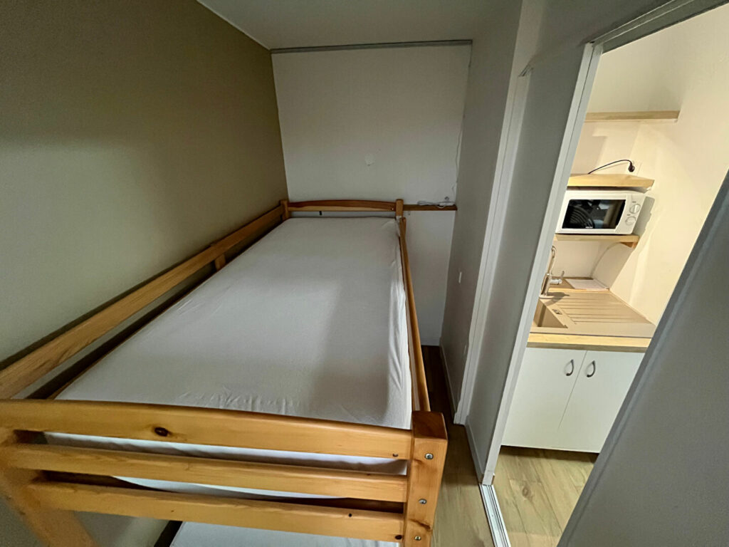 L’appartement comprend une entrée avec placards, une pièce principale équipée d’une cuisine parfaitement aménagée et équipée, une grande loggia fermée et chauffée, un espace nuit avec deux lits couchette ou convertible et une salle d’eau avec WC.